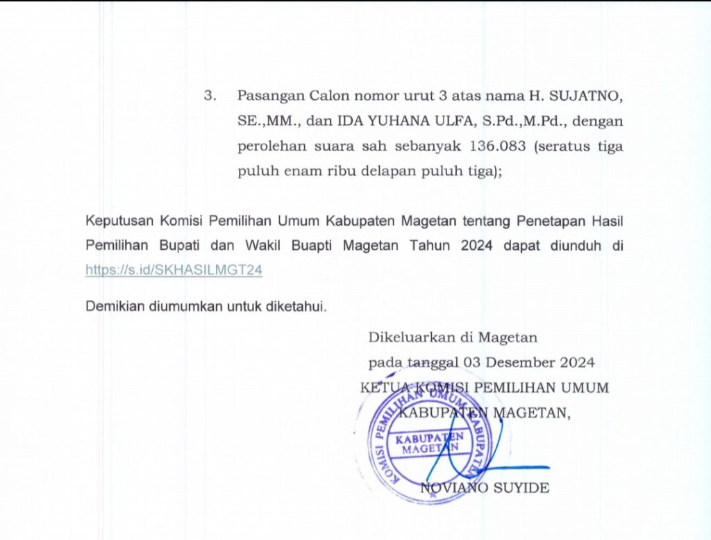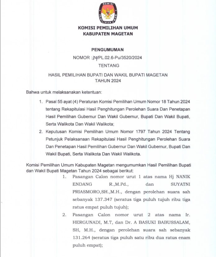 Matalensa-news.com-Magetan-Komisi Pemilihan Umum (KPU) Kabupaten Magetan secara resmi mengumumkan hasil Pemilihan Bupati dan Wakil Bupati Magetan Tahun 2024. Pengumuman tersebut tercantum dalam Surat Pengumuman No: 34/PL.02.6-Pu/3520/2024, yang dirilis berdasarkan hasil rekapitulasi suara tingkat kabupaten.